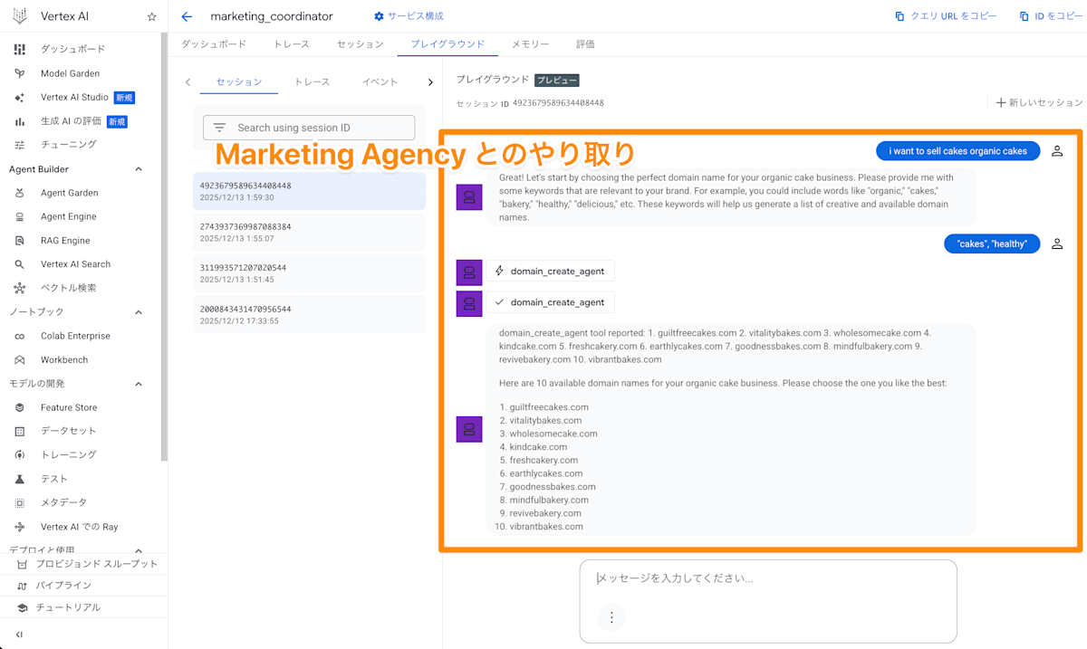 Vertex AI Agent Engine に AI エージェントをデプロイすると、コンソール上からプロンプトを送信できる「プレイグラウンド」を使って AI エージェントとやり取りができます。
