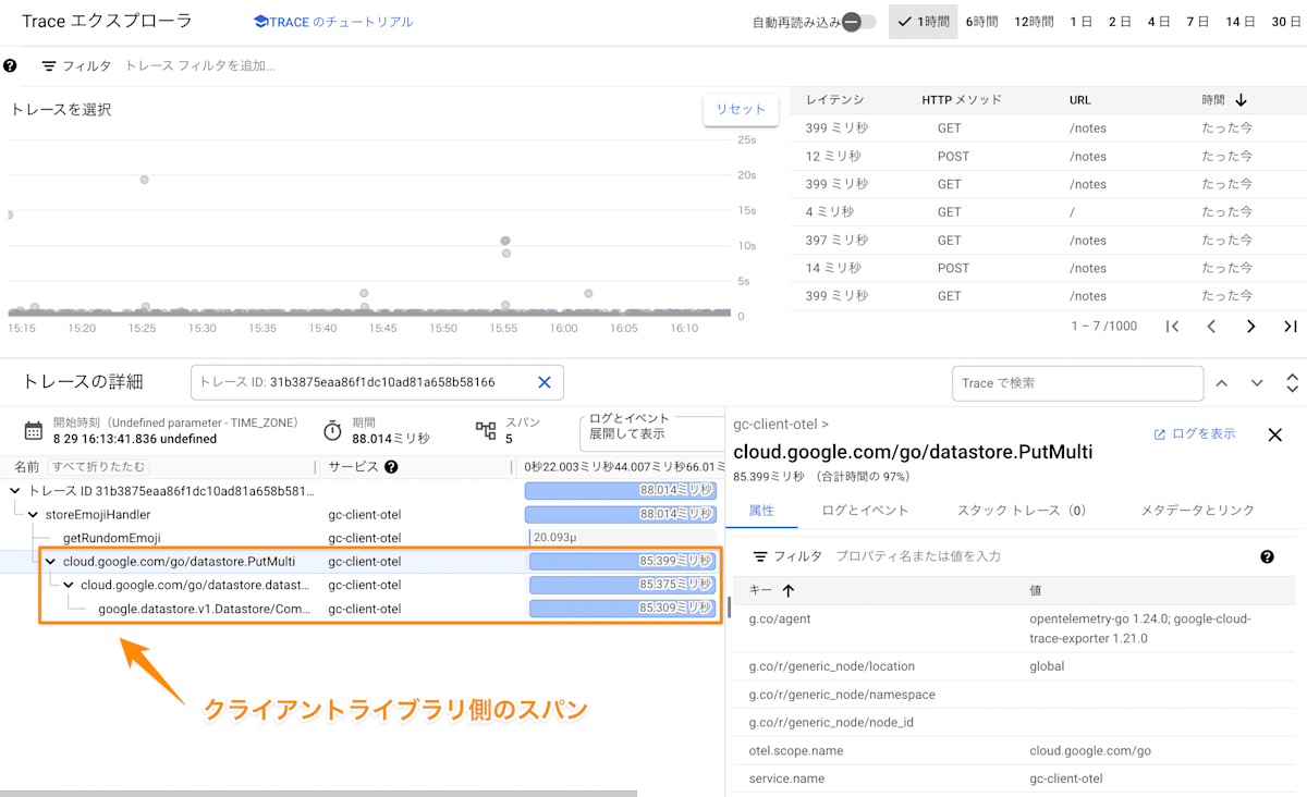 余談ですが、上図のスパンが実際にクライアントライブラリ側で生成されているコードは こちら です。トレースをすることで性能的な解析はもちろんですが、どういう流れで処理をしているかを大雑把に把握できるので、クライアントライブラリのソースコードを実際に読み解く必要があるときなどに便利です。
