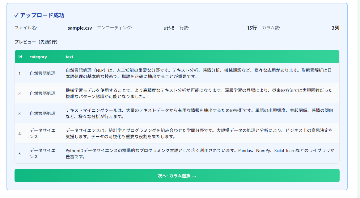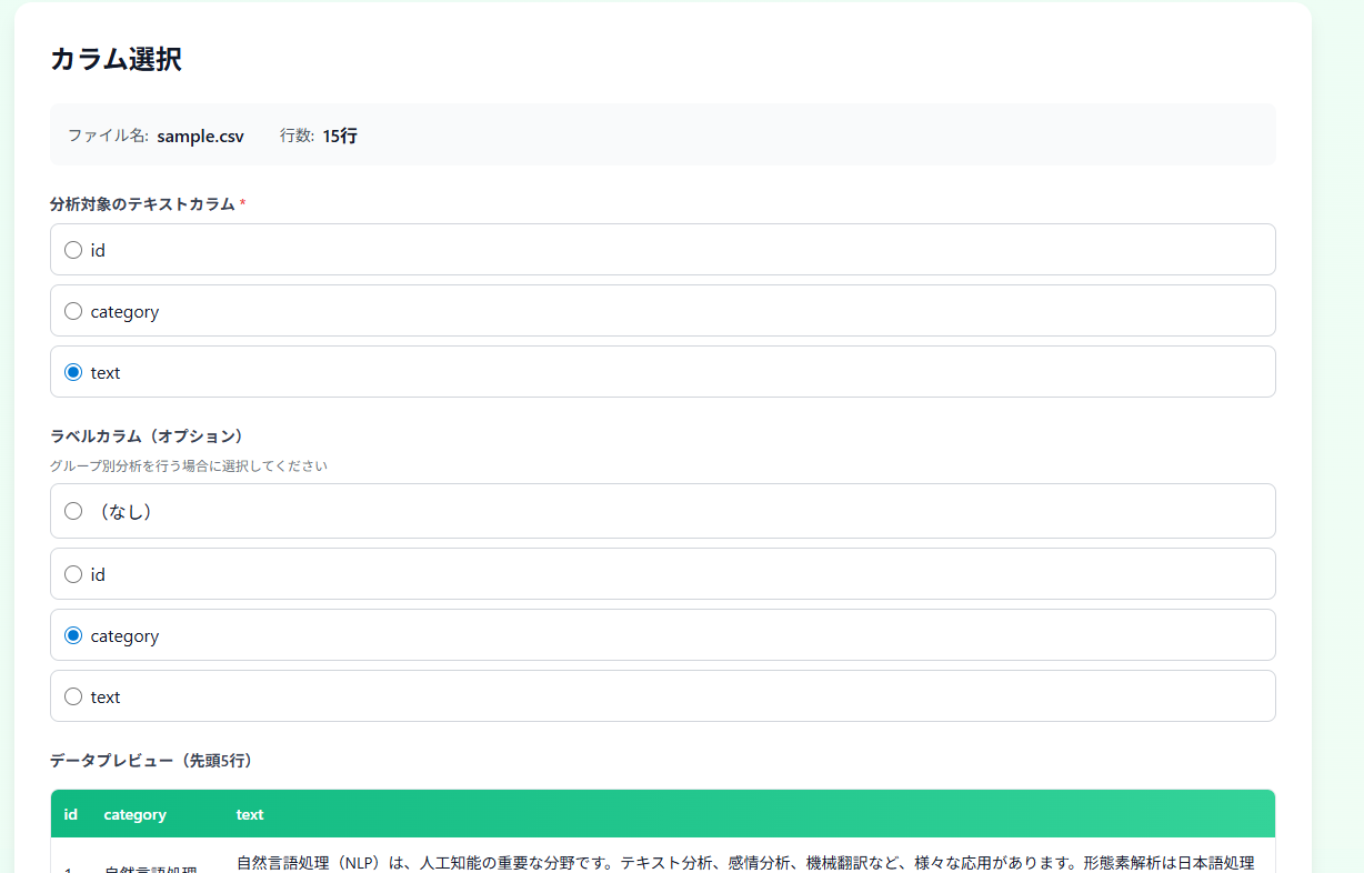 ここでは分析対象のテキスト(text)と、そのクラス分け(category)をラベルとして選択し