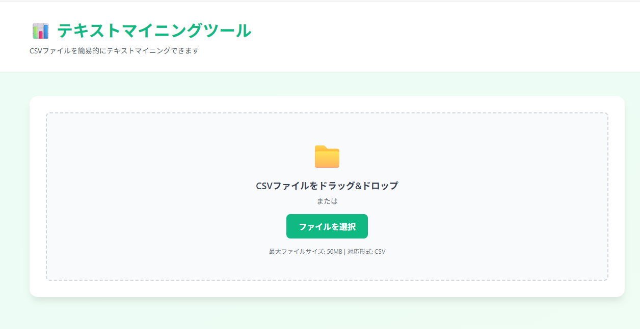 フロントエンドのトップページから分析ファイルのCSVファイルをアップロードしてください。