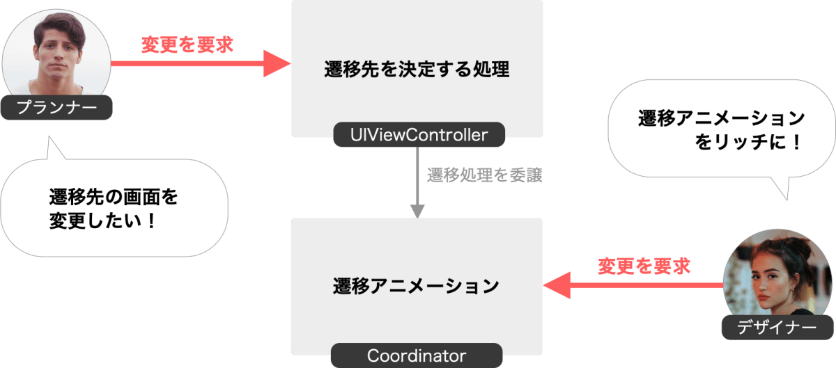 修正した設計と実装のイメージを示します.今回はCoordinatorパターンを使って,ViewControllerからCoordinatorへ遷移に関する具体的な実装を委譲しました.具体的には,ViewControllerからは遷移先の指定しか行わず,どのようなアニメーションを使って遷移するかの情報を一切持たないように変更しました.代わりに,そういう遷移に関することはCoordinatorクラスが行います.