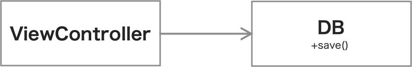 まず,抽象化を行わない場合のクラスの関係図を示します.DBにはsaveメソッドが実装されており,このメソッドを通して情報を保存できるとします.また,ViewControlelrはDBに依存しており,保持しているDBクラスのインスタンスを通して情報を保存します.