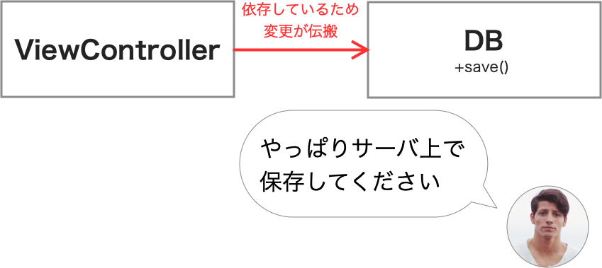 情報の保存先は,開発中のアプリがマルチプラットフォーム展開していく際に,ローカルDBからサーバ上のDBへ移行していくかもしれません(*2).そういうケースにおいてViewControlelrへ変更が伝搬してしまう現状は,OCP違反と言えそうです.