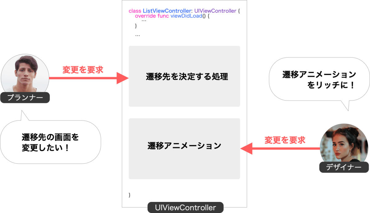 SRPに従っていない例として次のような設計が挙げられます.俗に言うFatViewControllerです.このViewControllerは,プランナーとデザイナーという2人のアクターからの要求を受け付けているため,SRPに違反しています.