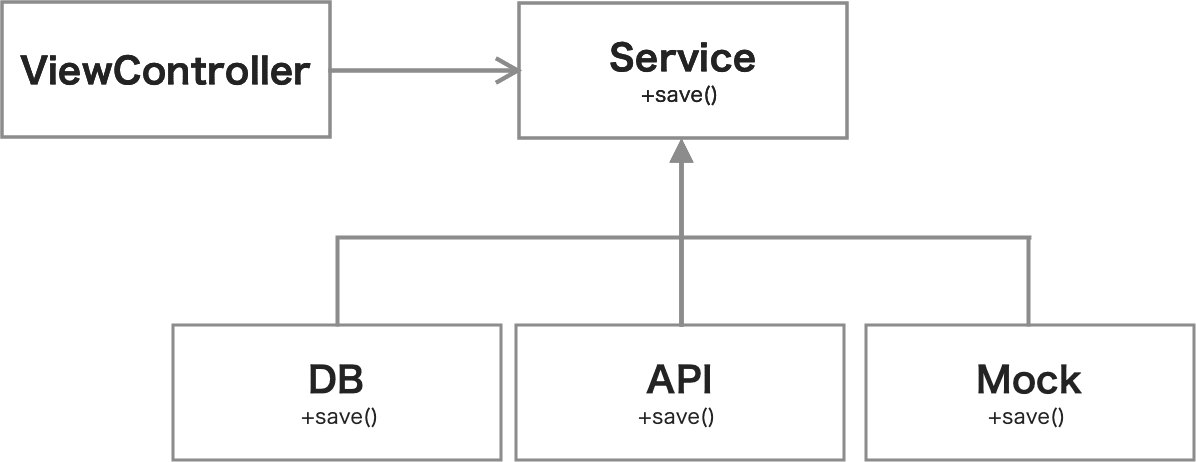 次に,抽象化を行った場合のクラスの関係図を示します.この場合は,ViewControlelrはDBを直接持つのではなく,抽象化されたServiceを持ちます.そのため,保存先をローカルDBからサーバ上のDBへ変えた場合も,ViewControllerには変更が伝搬することはありません.つまり,新しくクラスを追加しViewControllerへ注入するだけで振る舞いを変更できるため,拡張および修正に対して閉じた状態になりました.