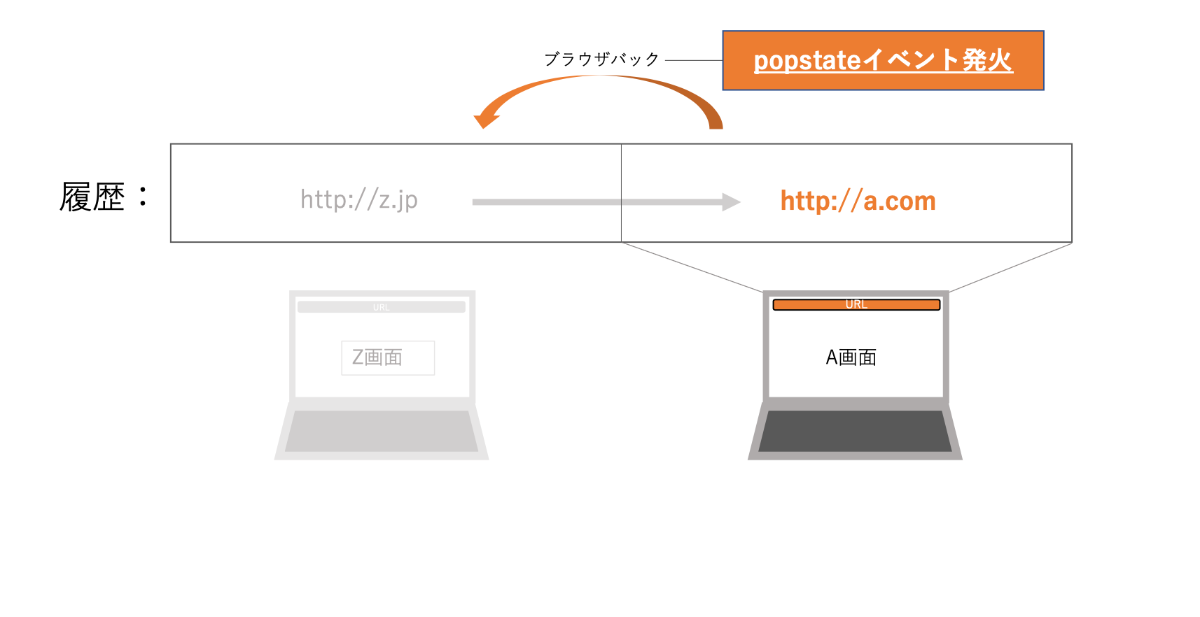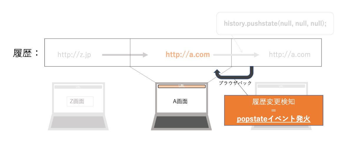 上記、右のA画面から左のZ画面へ遷移する際にpopstateイベントを発火させたい。