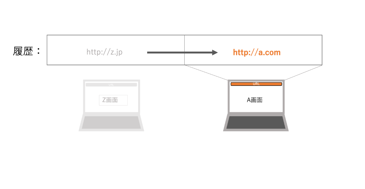 ※この際、履歴上はpushしたURL(一番右のA画面)に移るが、historyAPIを使って履歴を変更した場合、画面ロードが走らないため、画面はpush前のURLの画面(真ん中のA画面)が表示されている。