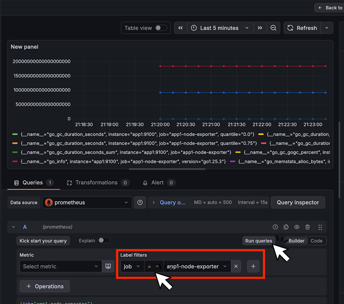 jobでフィルタリングすると、各 ECS サービスに限定してメトリクスを確認できます。Run queriesを押下することでクエリが走ります。