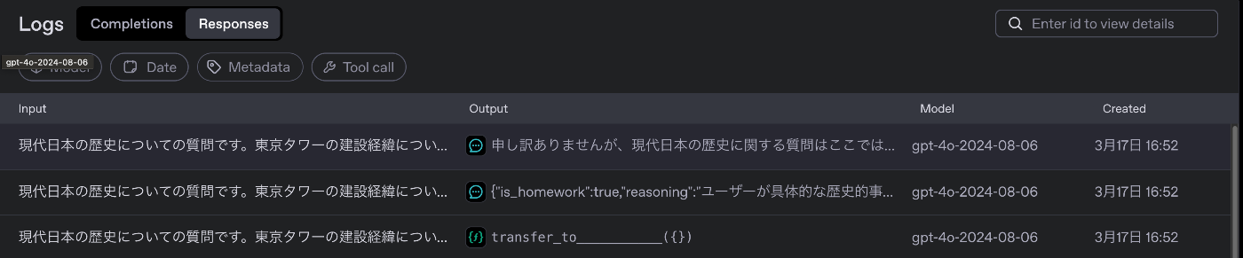 なお、歴史専門のエージェントには、tools=[WebSearchTool()]としてResponses APIのbuild-in-toolsの一つであるweb検索のツールを設定しています。