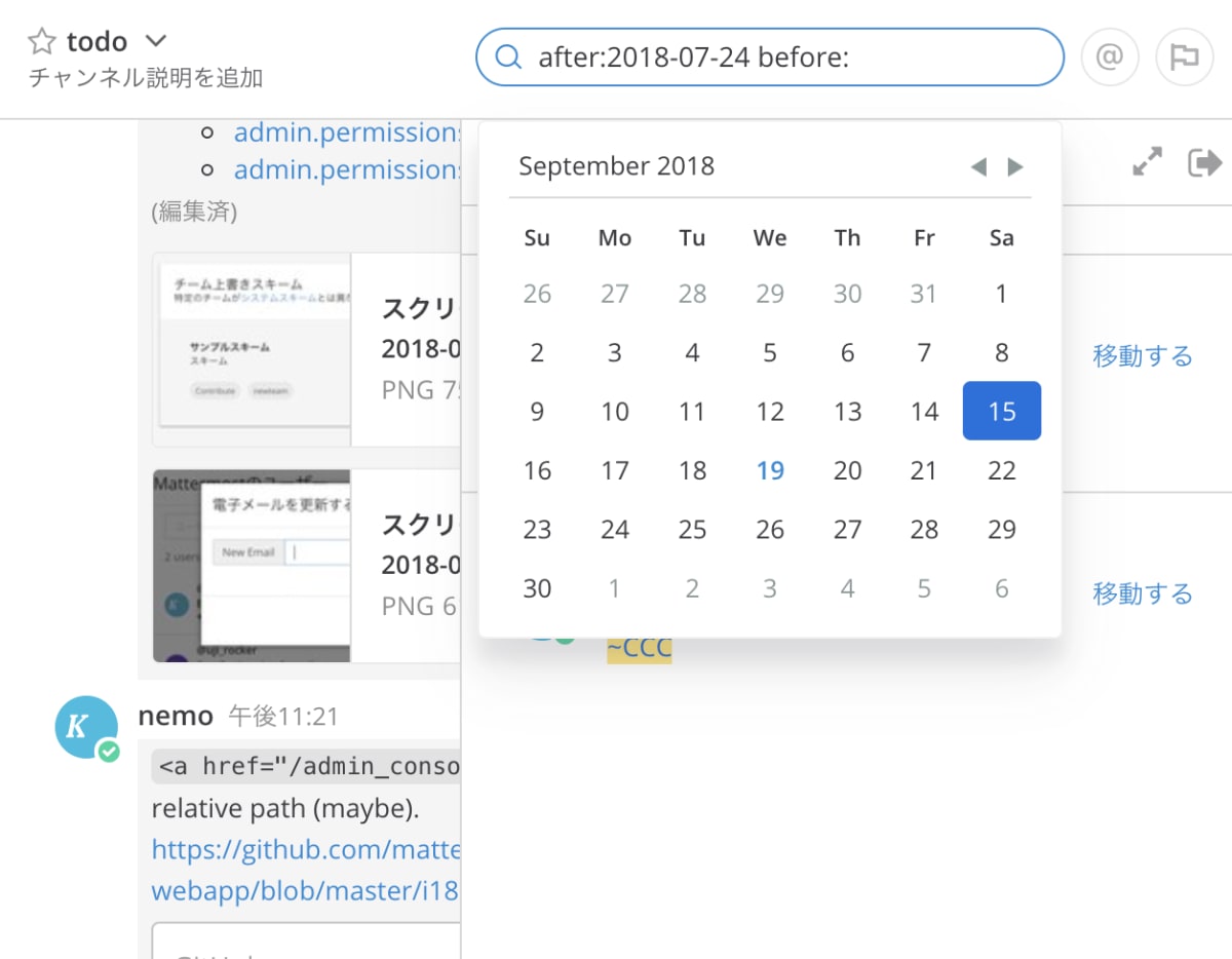 Mattermost メッセージ検索機能で投稿日付を指定できるようになりました。