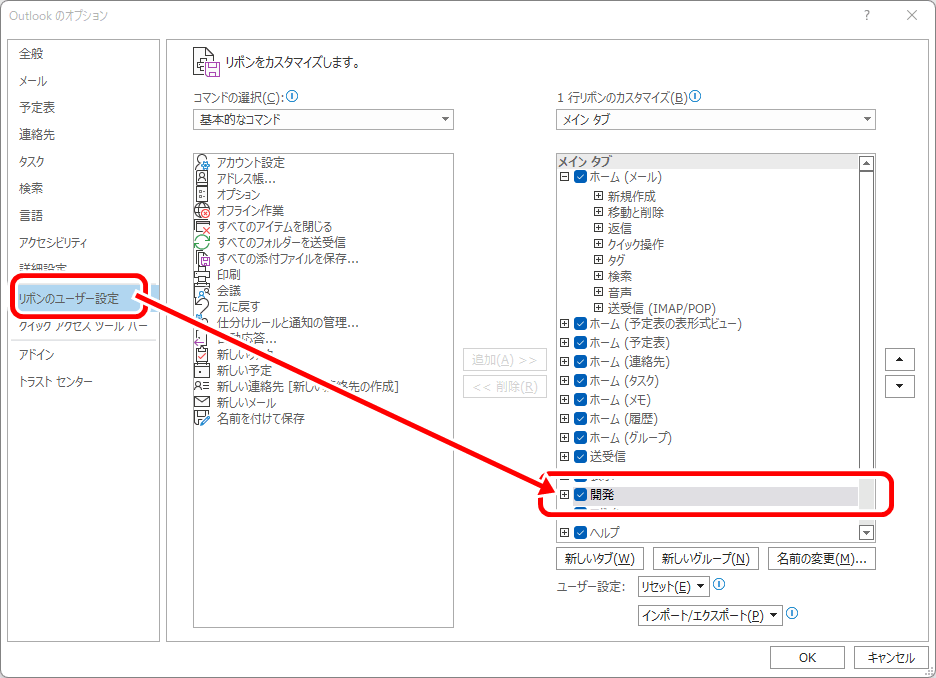 3.リボンのユーザ設定を選択して、右のボックスの開発にチェックを付け、OK をクリックする。
