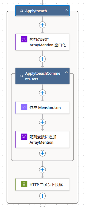 Apply to eachでレコードをループします。メンション先も複数あるため、さらにその中にApply to eachをいれて、メンション先のJSON文字列を生成します。