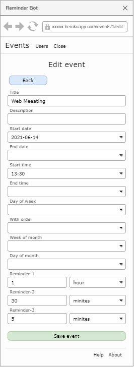 | Show events | Reminder BOT Webサイトを表示する | 全て (自分の予定を表示する) |