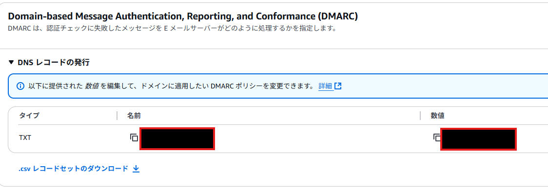 更に画面下のDomain-based Message Authentication, Reporting, and Conformance (DMARC)のDNS レコードの発行をクリックして、TXTを確認する。