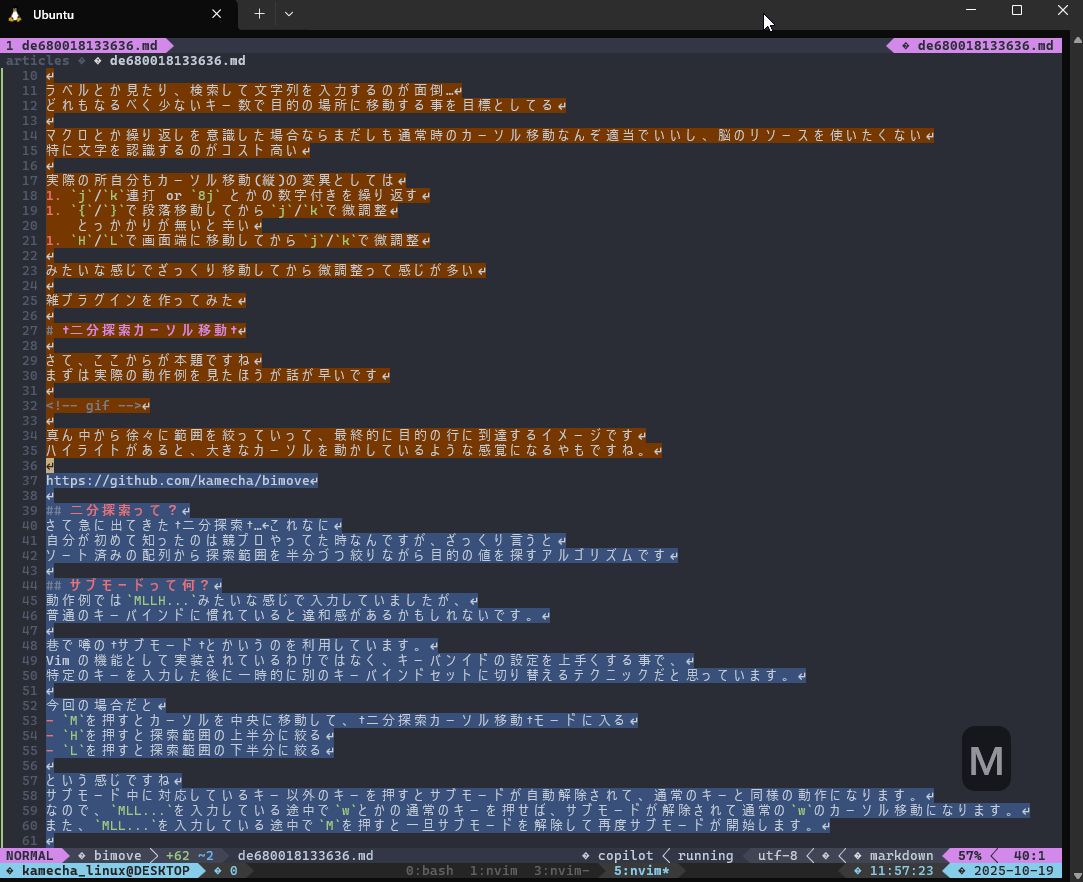 みたいな感じで、徐々に便利なキーマップを覚えつつも、大雑把に移動してから微調整するスタイルは変わっていません。