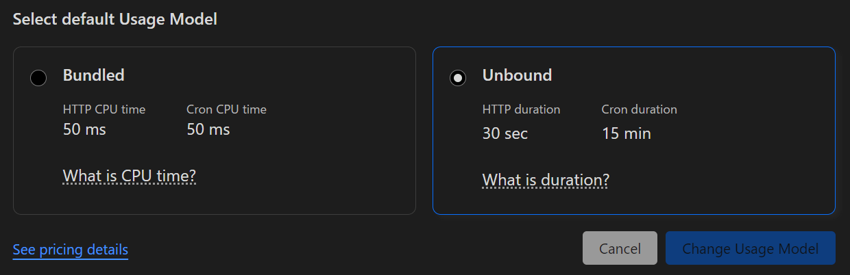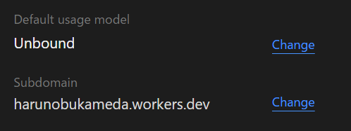 月五ドルです。上記同様自分への投資と思えば安いものなので興味がある方は払ってしまいましょう。Workersは無償プランでは10msまでのCPU時間を使えますが、OpenAI等、外部APIを呼び出す場合これはタイムアウトしてしまいます。このためUnboundモードに切り替え利用可能なCPU時間を30秒に延長させます。