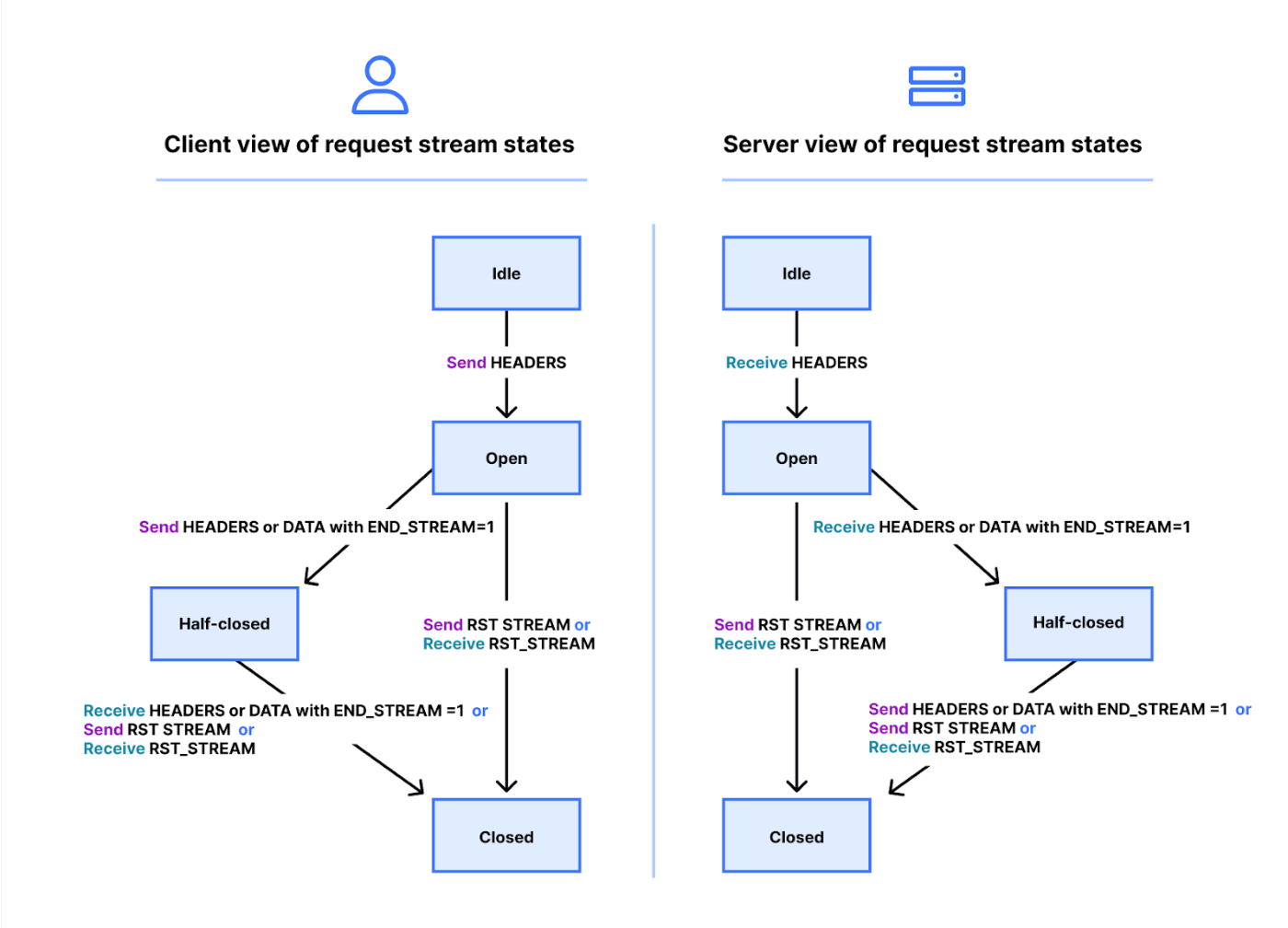 キャンセルされたリクエストストリームは、ストリームのライフサイクルを急速に遷移します。END_STREAMフラグが1に設定されたクライアントのHEADERSは、状態を idleからopen、half-closedへと遷移させ、RST_STREAMは直ちにhalf-closedからcloseへと遷移させます。
