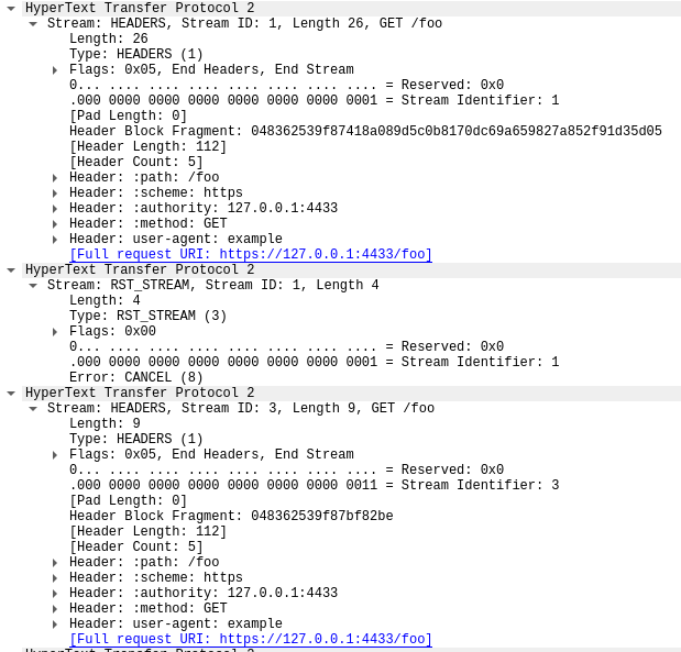サーバーは100の同時ストリームをアドバタイズしていたが、クライアントが送信したパケットはいずれも、それよりも多くのHEADERSフレームを送信していたことに注意してください。クライアントはサーバーからの返送トラフィックを待つ必要はなく、送信できるパケットサイズによってのみ制限されていた。このトレースにはサーバーのRST_STREAMフレームは見られず、サーバーが同時ストリーム違反を観測しなかったことを示しています。