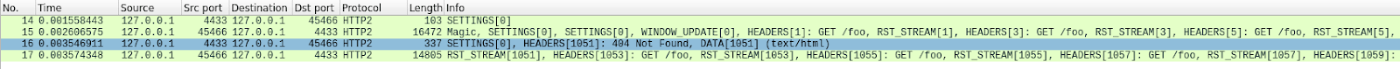 興味深いことに、ストリーム1051のRST_STREAMはパケット15に収まらないので、 パケット16でサーバーが404応答で応答するのが見えています。 それからパケット17でクライアントはRST_STREAMを送信し、残りの475リクエストの送信に移ります。