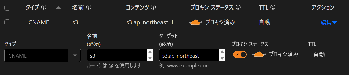 この際オレンジモードにします。オレンジモードとはAliasレコードと似ているCloudflareの機能で、CNAMEにもかかわらずAレコードの様に名前を直接解決します。つまりIPアドレスで直接S3にアクセスを行います。