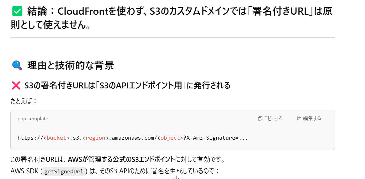 先日とある質問がありました。S3の署名付きURLでカスタムドメインをベースとしたURLは発行できるか?