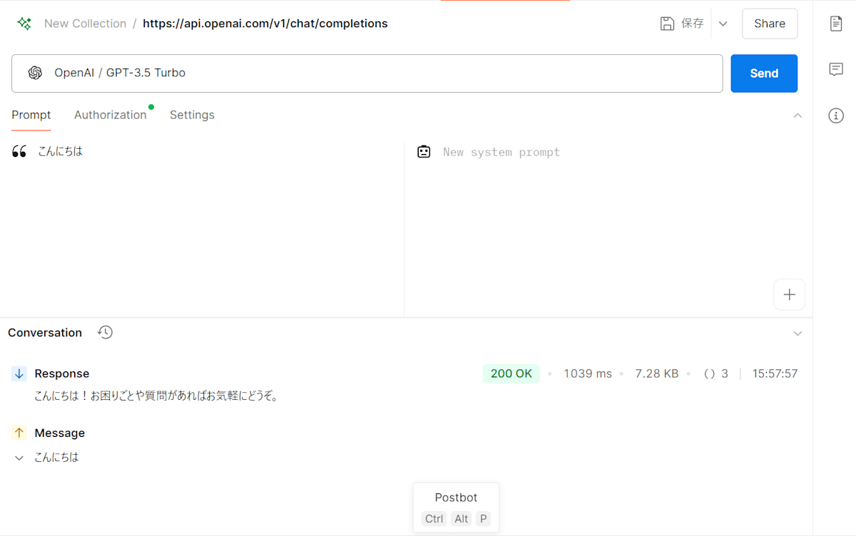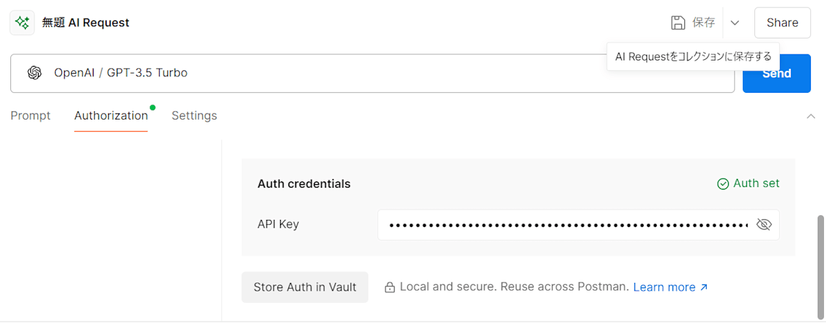 次にAuthorizationタブからOpenAIのトークンを設定して保存します。