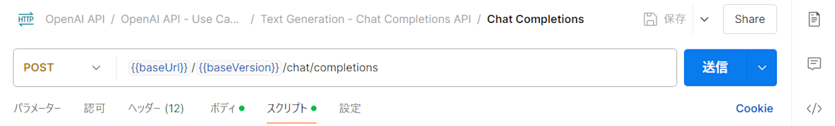 ここで{{messages}}と変数がセットされていますがこれは過去の記事で触れたPre-Requestでメッセージを組み立てています。