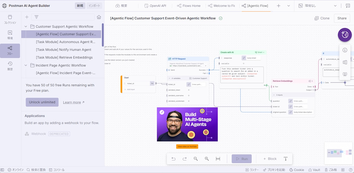 AI Agent Builder若干ブルーバッジ付与済ワークスペースと考え方は似ていますが、特定生成AI用ではなく、よく使われる生成AIのAPIコールがあらかじめPostmanの標準機能としてコレクションやフローで使えるように準備されたもの、になります。