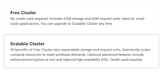 Freeクラスターモードはクレジットカード不要で50GiB,5千万回のリクエストユニットが使えます。一方Scalableクラスターモードではクレジットカードが必要ですが以下のメリットがあります。