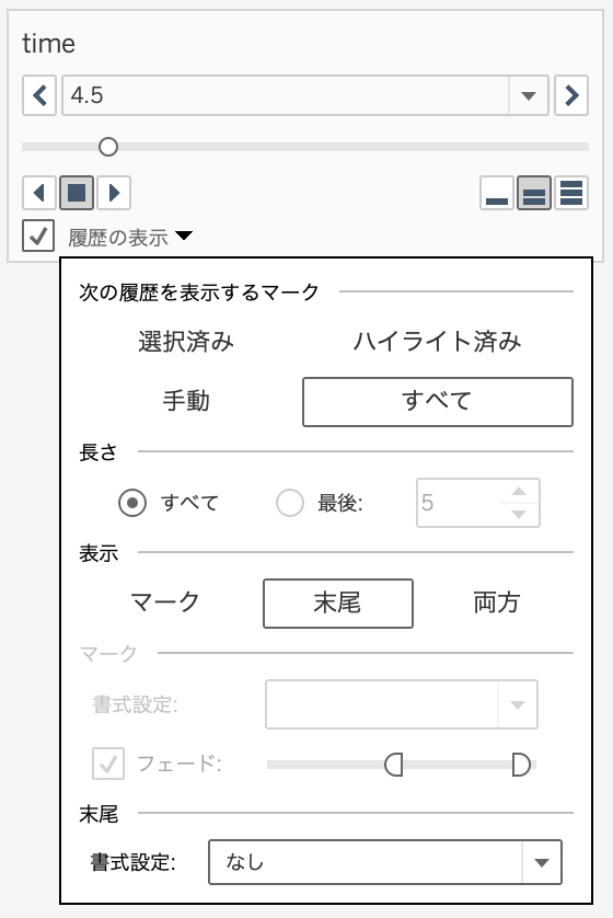 そして、[time]を「ページ」に入れることでアニメーションが完成します。「履歴の表示」の設定は以下の通りです。