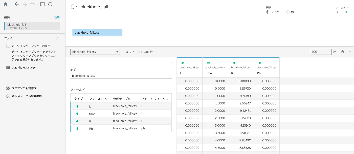 今回は、粒子がブラックホールに吸い込まれていく様子をVizで表現します。軌道をアニメーションで表現したいので、欲しいデータセットは[時刻], [座標]の形式になります。