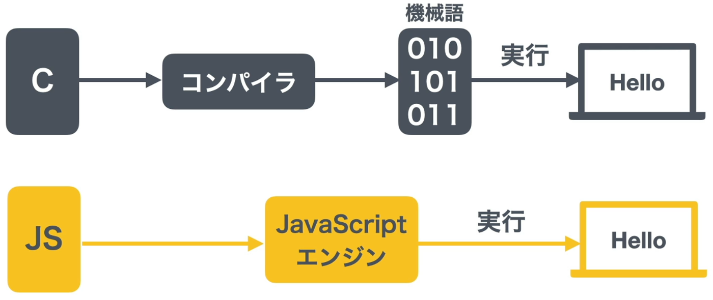 - JavaScriptの場合:JavaScript エンジンがコードを読み取り、その場で機械語に変換して実行する