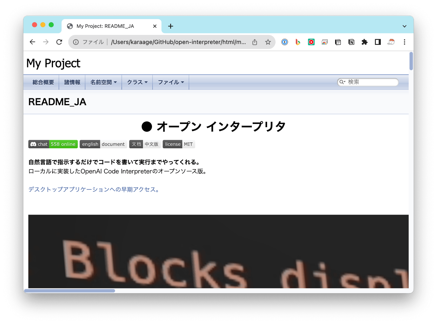 Open Interpreterで試してみた例です。それっぽいドキュメントが生成されます。