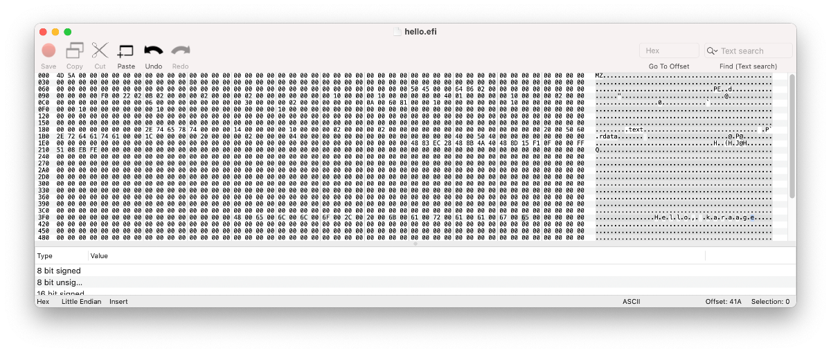 hello.efiをバイナリエディタ(0xED)で開きます。「Hello, World!」のところを「Hello,karaage」に変更します。