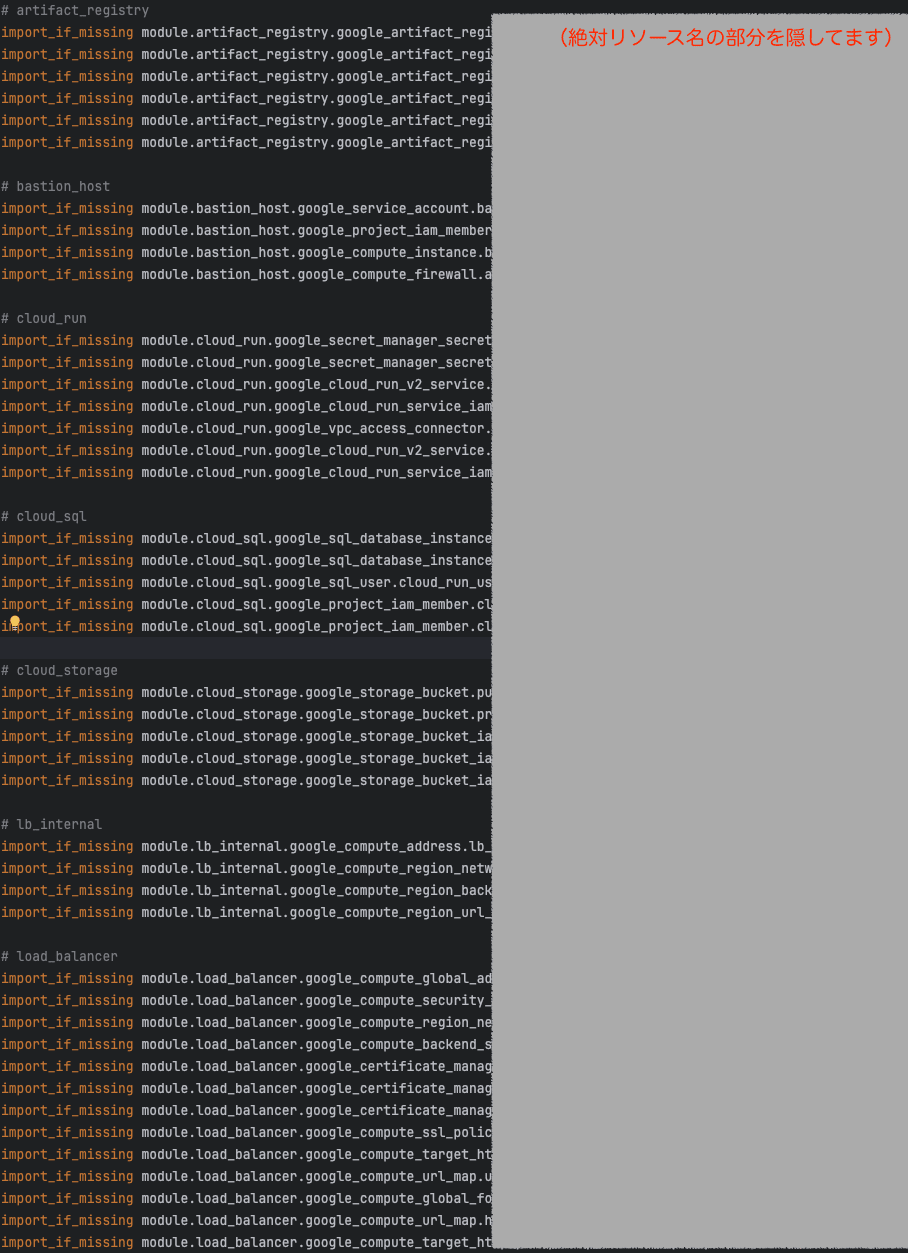 どれをimportしたか覚えてたら問題ないんですが、管理するリソースの数が増えたり減ったりしてガチャガチャやっているうちに大体よくわからなくなります。