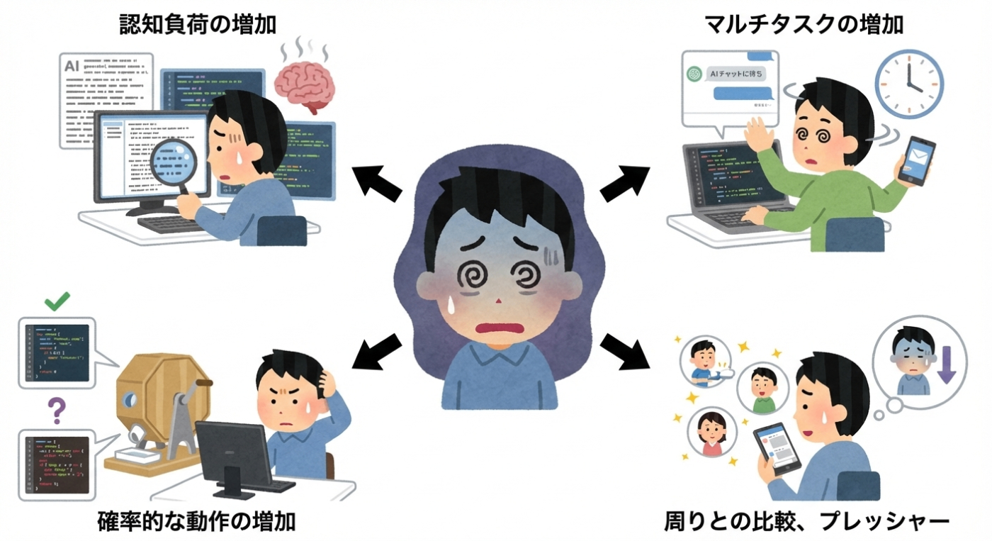 止め処無いAIのアウトプットによる情報過多が脳に過度な負担をかけ、深い疲労感をもたらします。