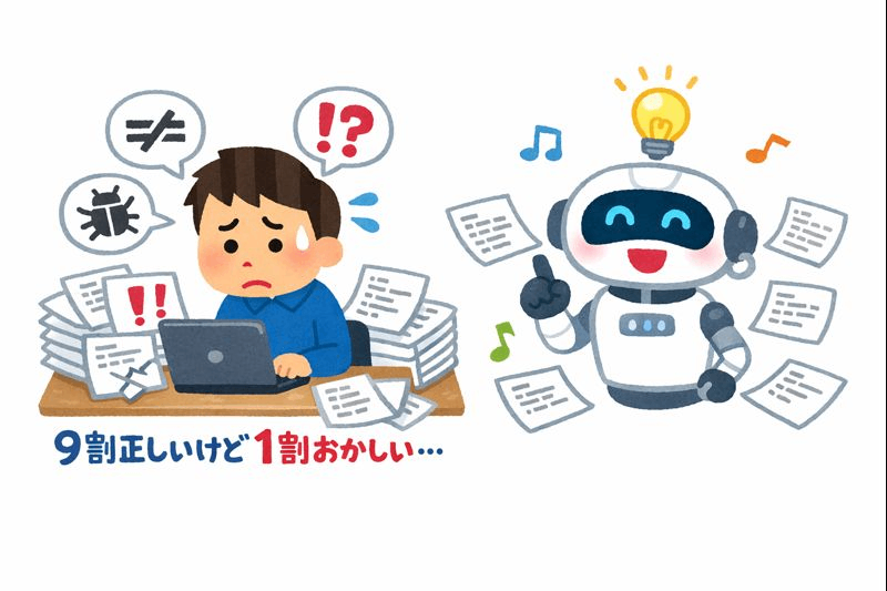 以前、業務で使うツールをAIに補助させながら開発していたことがあります。APIのラッパーコードやテストコードをAIに生成させていたのですが、最初はかなり便利でした。ただ、しばらくすると「9割正しいけど、1割おかしいコード」が大量に溜まり始めました。
