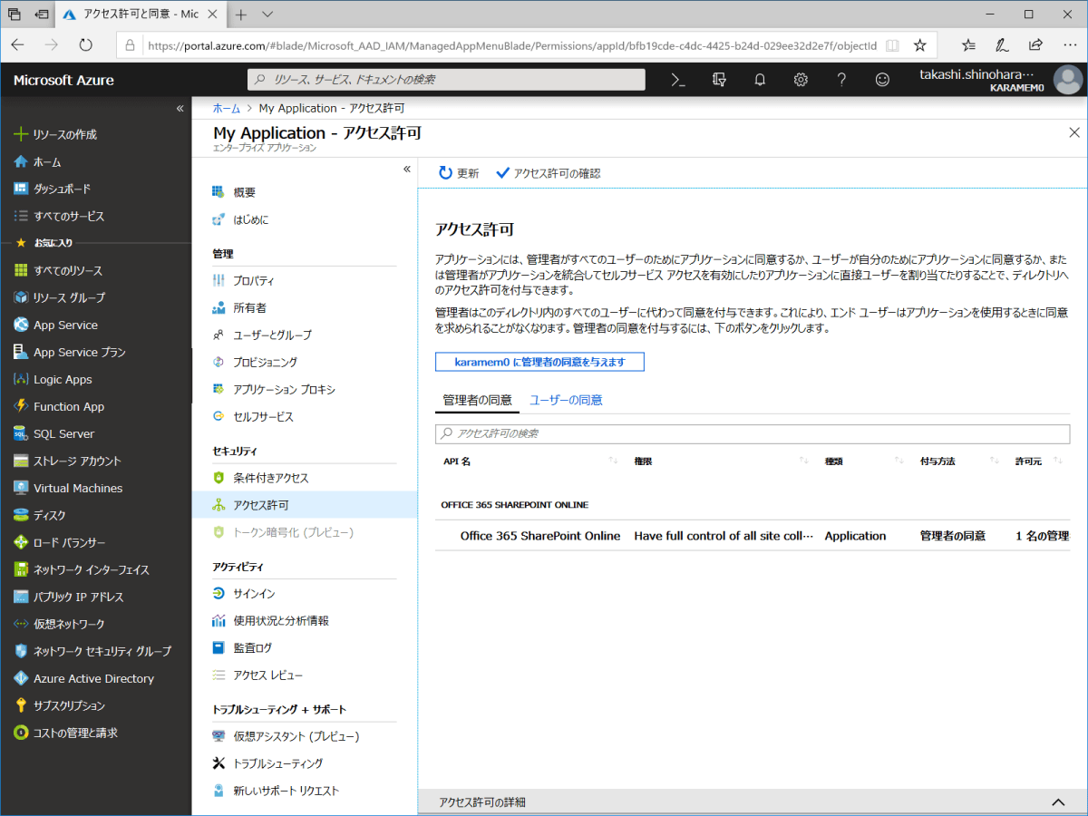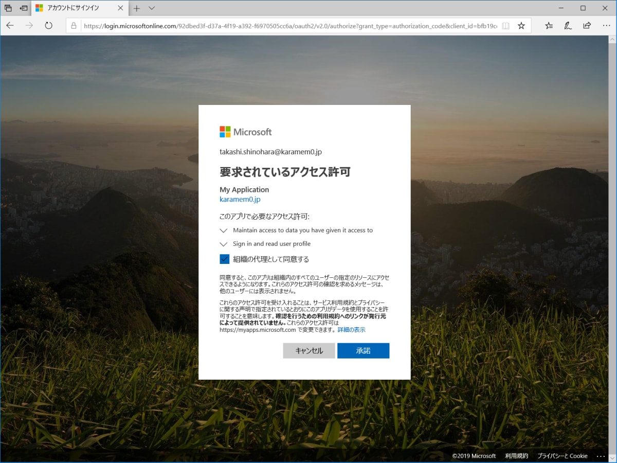 最近のアップデートにより、管理者の場合はアクセス許可の画面で 組織の代理として同意する オプションが利用できるようになりました。これまでは AdminConsent を https://login.microsoftonline.com/common/adminconsent で実施していました。今後はこの手間が省略できます。
