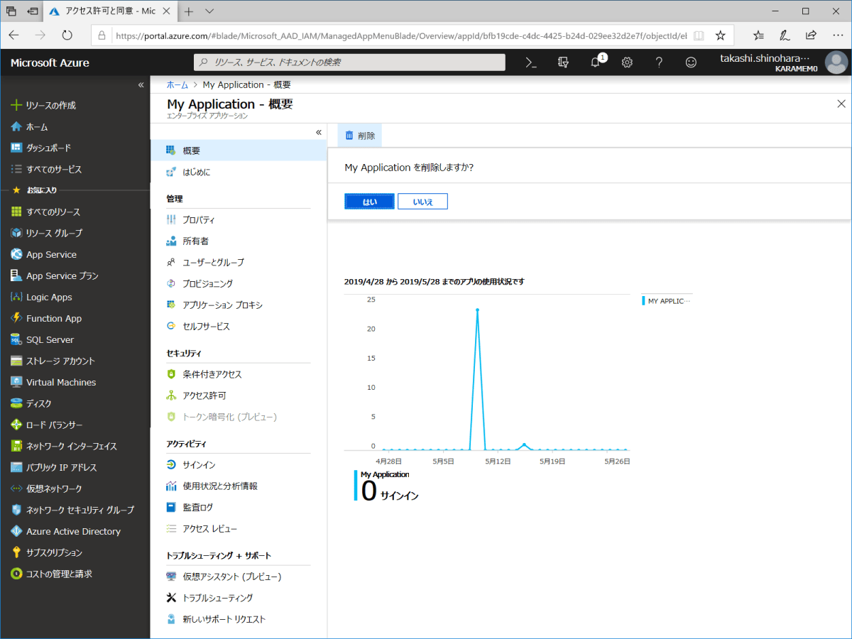 場合によっては、変更が反映されるまでに時間がかかります。開発中はこの遅延が負担となるため、Azure ポータルの Azure Active Directory - エンタープライズ アプリケーション - 概要 から削除することを推奨します。この操作ではテナント内のアプリケーション設定のみが削除され、アプリ自体は削除されません。