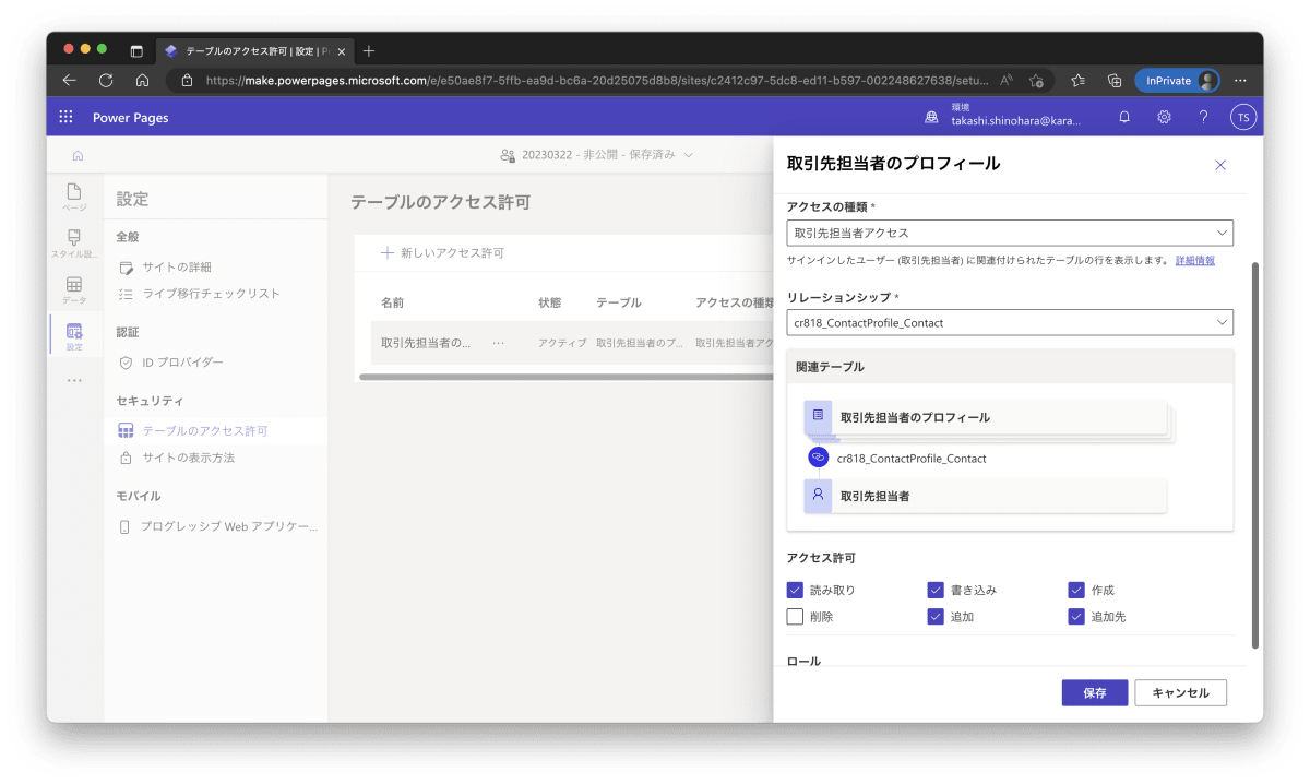 取引先担当者プロフィール に対するアクセス許可を追加します。アクセス許可の種類 を 取引先担当者アクセス に設定します。これにより自分のレコードのみ参照できるようになります。