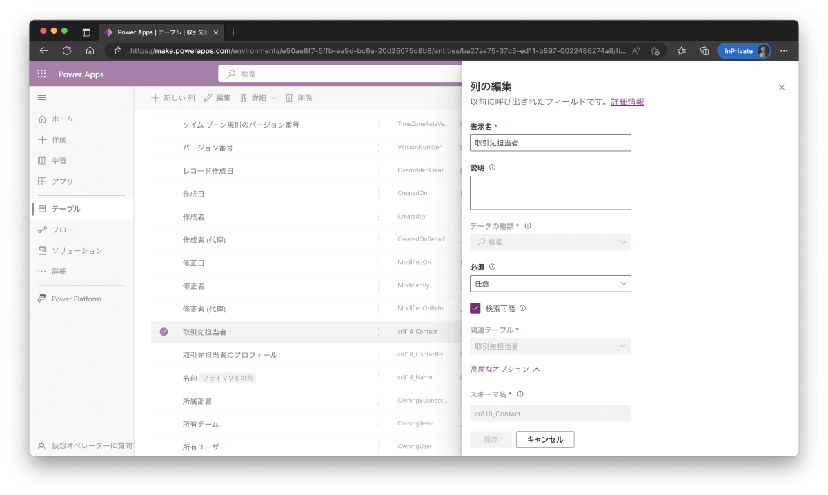 取引先担当者 列を追加します。これは取引先担当者とリレーションを設定します。
