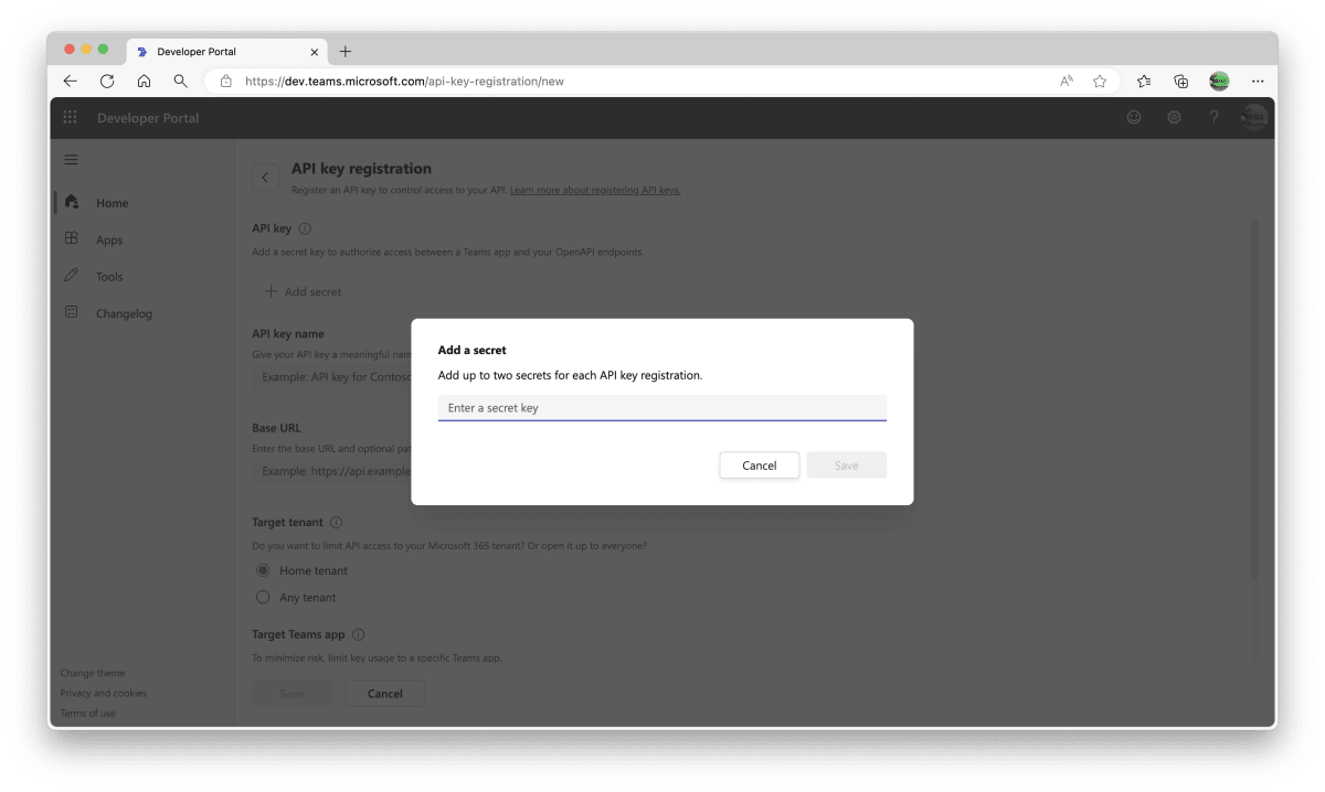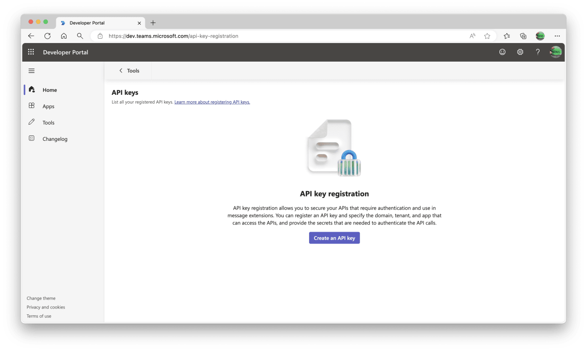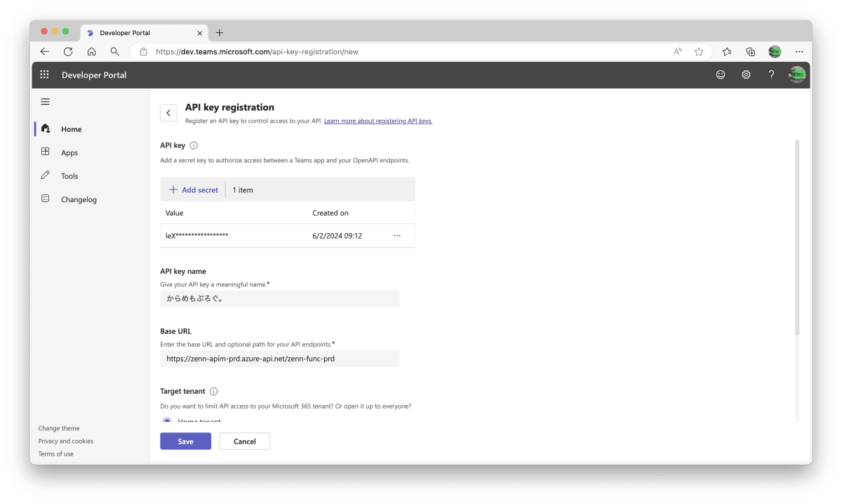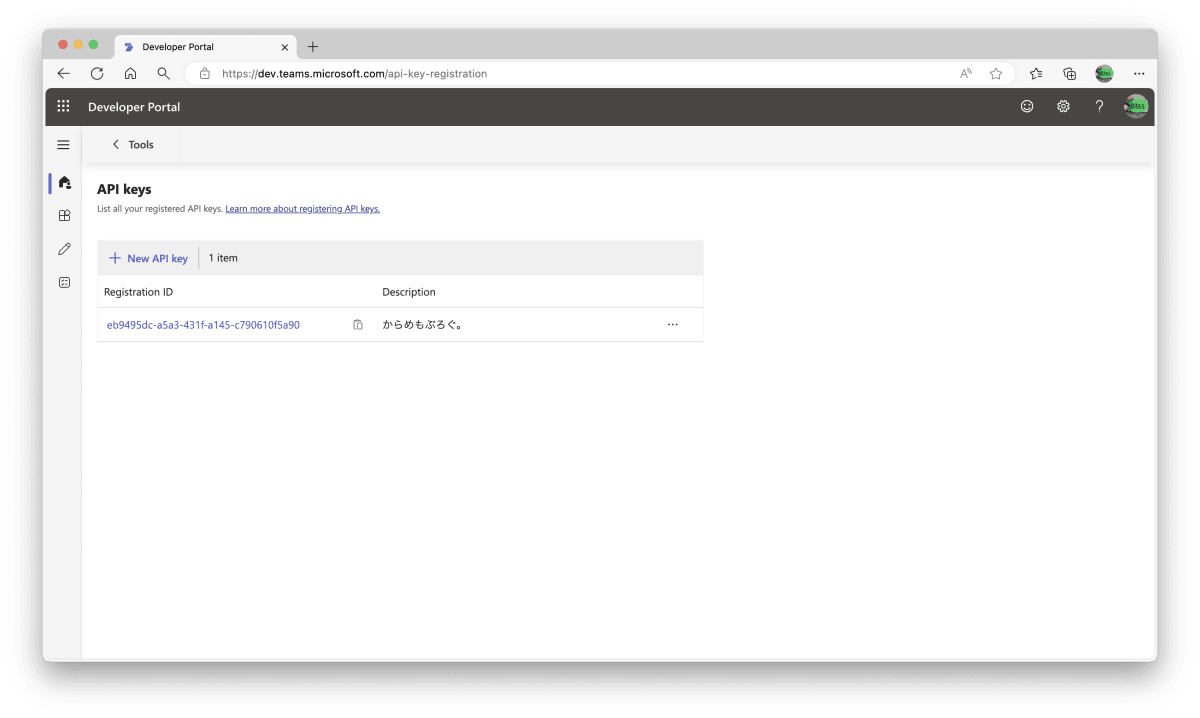 シークレットはアプリ マニフェスト ファイルに記載するのではなく、開発者ポータルに設定しアプリ マニフェスト ファイルから参照する形になります。開発者ポータルで Tools - API key registration - Create an API Key をクリックします。