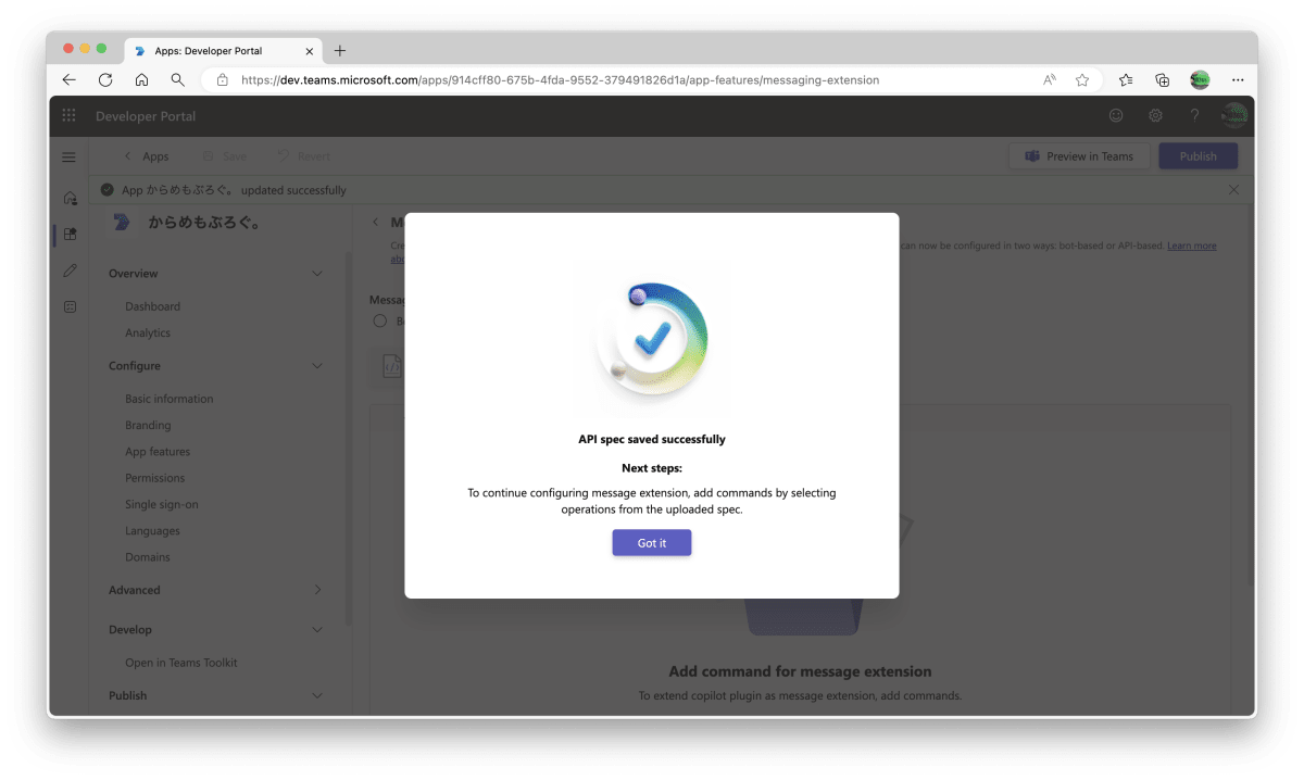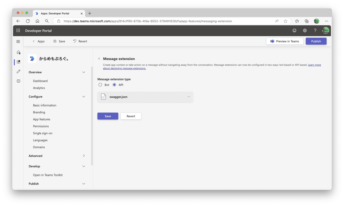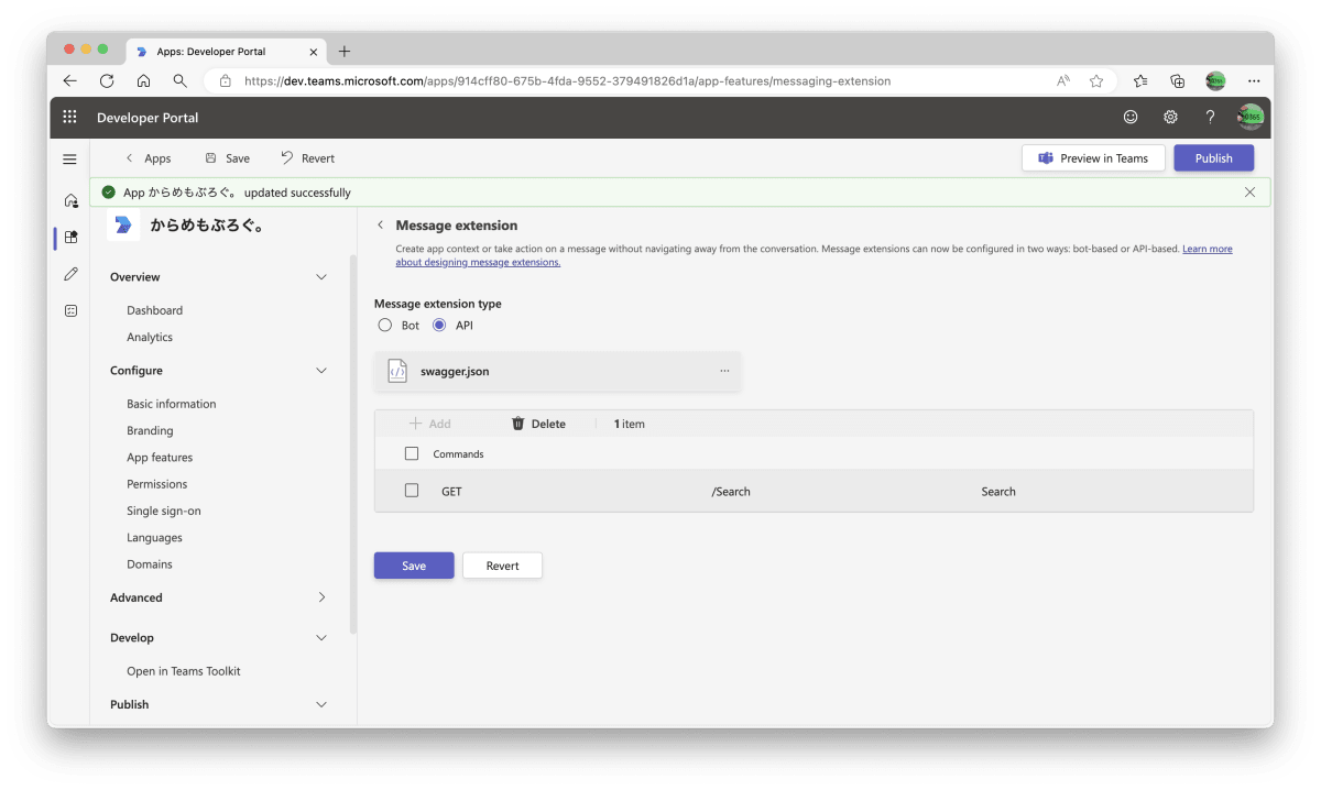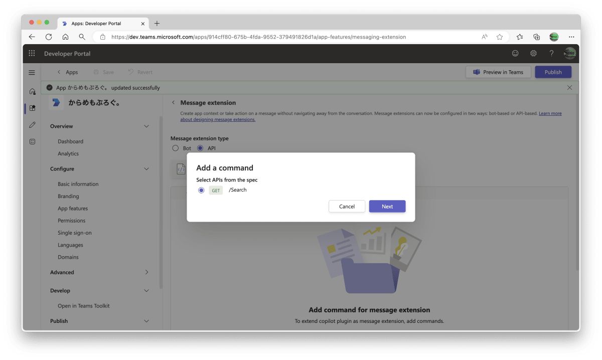 App Feature で Message extensions をクリックします。Message extension type で API を選択し、OpenAPI 仕様をアップロードします。Save をクリックします。