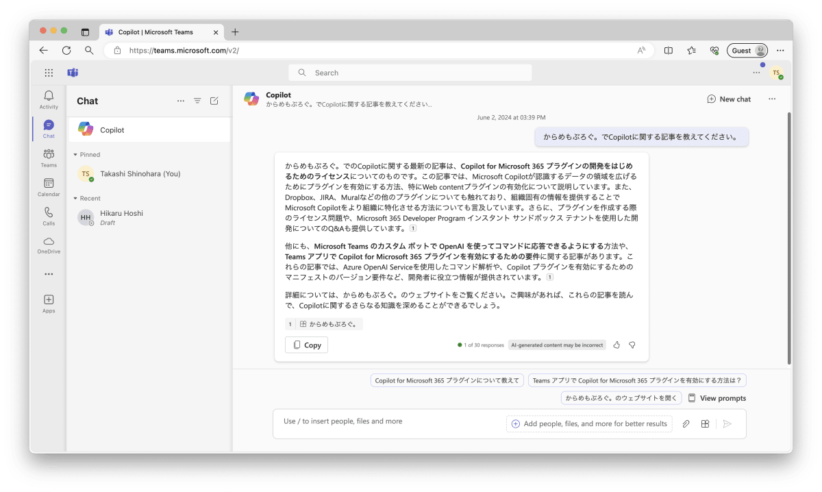 Copilot に質問すると、検索結果をもとに回答できることが確認できます。