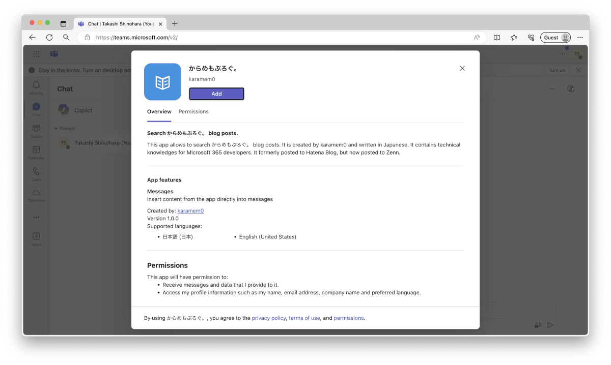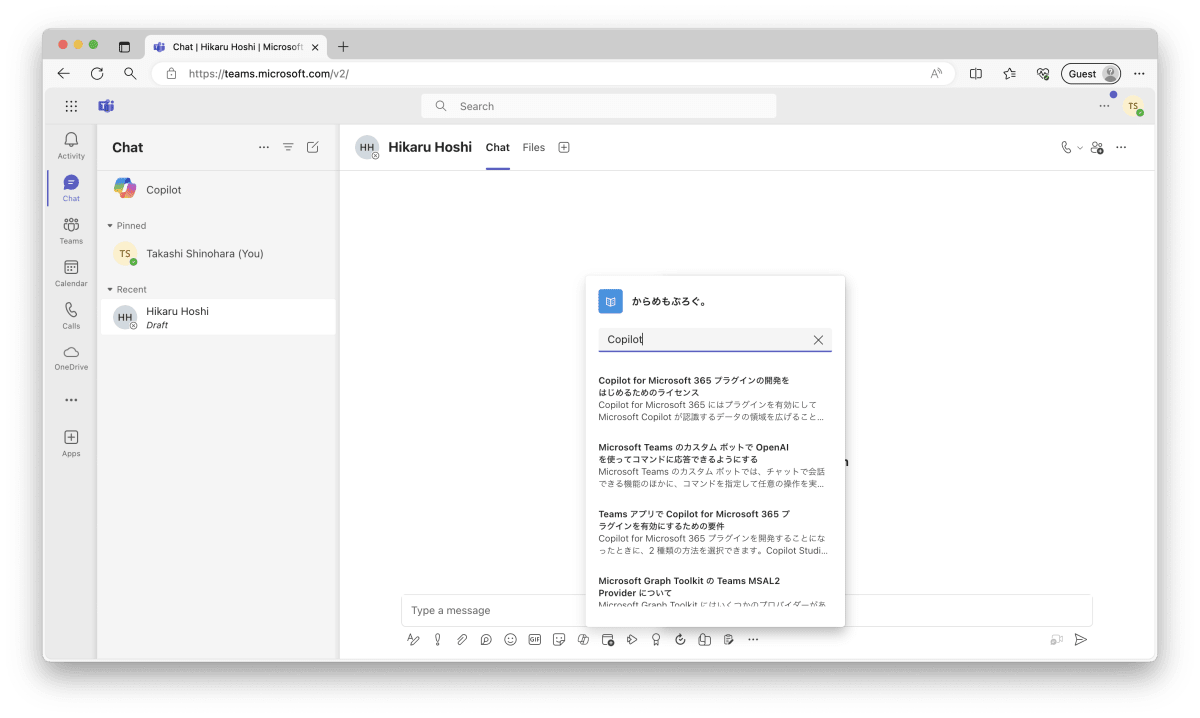 まずはメッセージ拡張機能のみで動作することを確認します。チャットで拡張機能を表示して検索すると、検索結果が表示されることを確認できます。