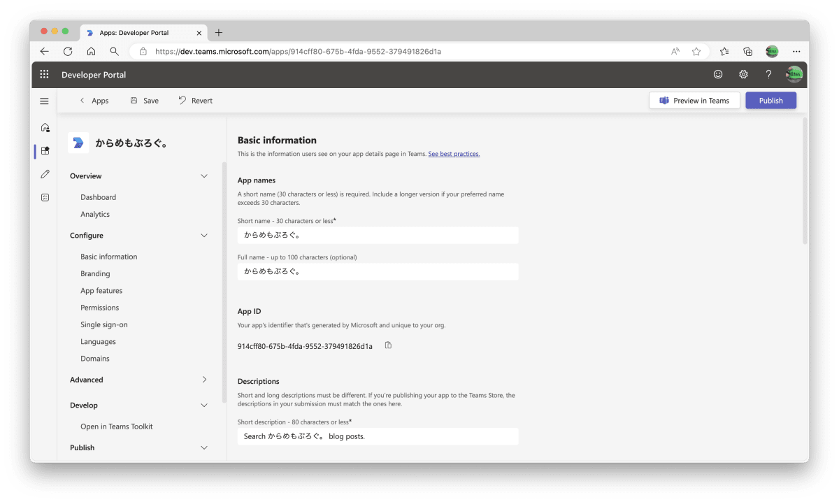 Basic information でアプリの情報を入力します。これは Copilot for Microsoft 365 からの呼び出しに使用されるため、説明は詳細に記載してください。入力後、Save をクリックします。