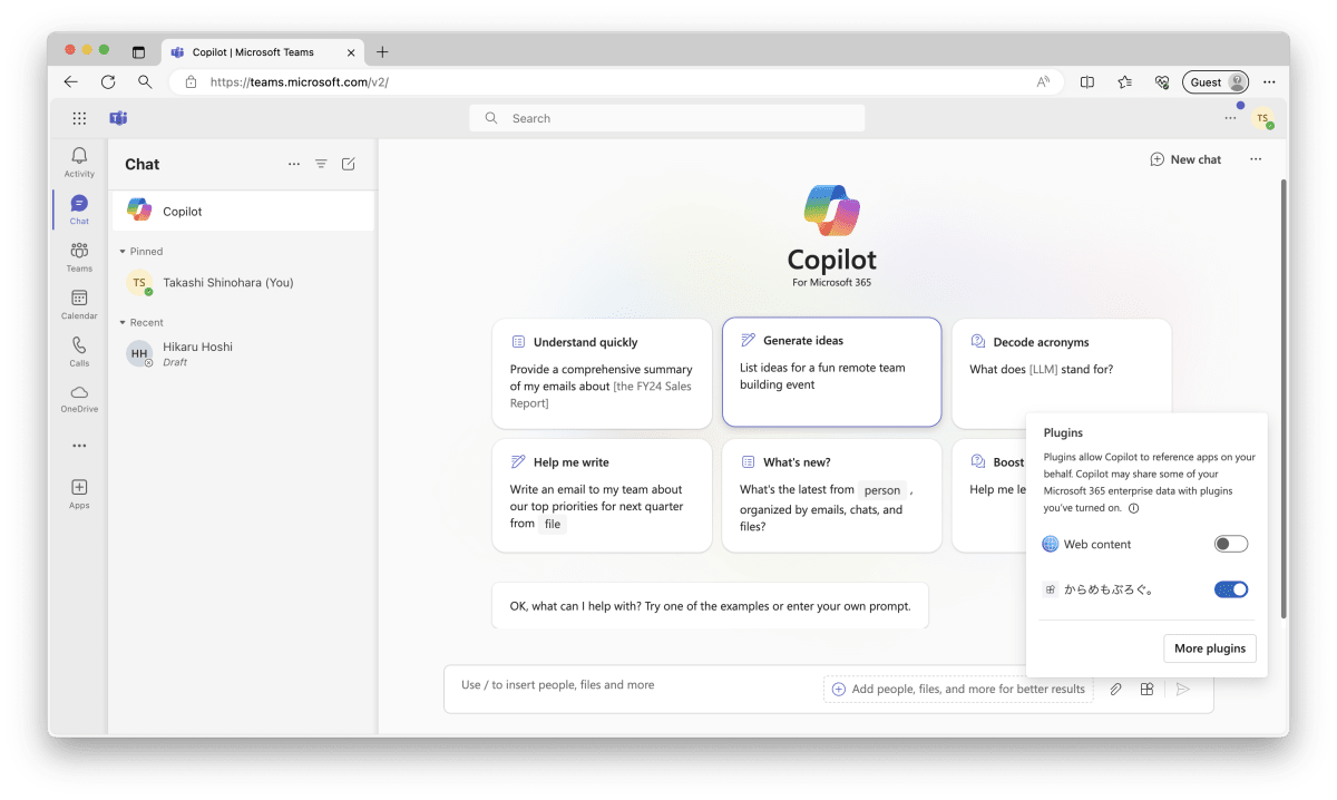 次に Copilot での動作を確認します。Copilot チャットで拡張機能をオンにします。