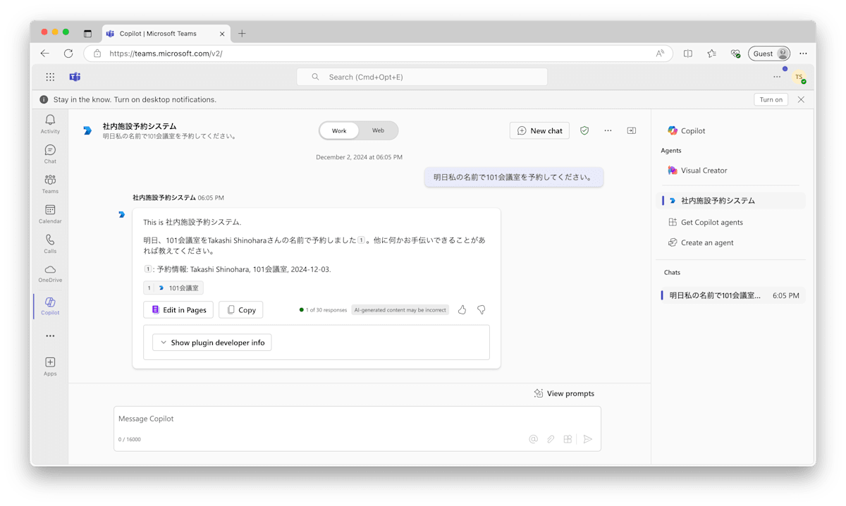 Microsoft 365 Copilot の宣言型エージェントでは、API プラグインに対して GET または POST の呼び出しができます。POST ができるということは、任意のデータを渡すことができるということです。今回は、施設予約をする API を呼び出す宣言型エージェントを作成します。