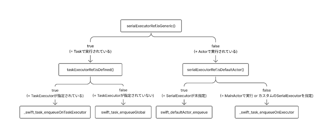なお、ここで最終的に呼ばれる各メソッド (_swift_task_enqueueOnTaskExecutor・swift_task_enqueueGlobal・swift_defaultActor_enqueue・_swift_task_enqueueOnExecutor) の内部実装に関しては、別の記事で解説する。