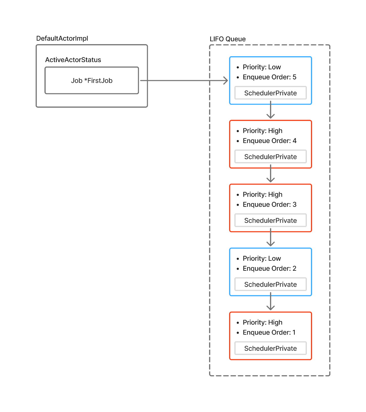 少々ややこしいことに、Default Actorは、このprioritizedJobsも含めて、2つの異なるキューを使用している。これら2つのキューについて説明する。